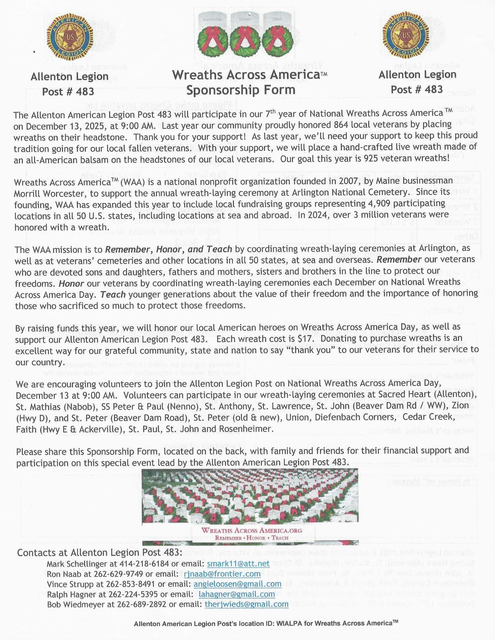 The Allenton American Legion Post 483 will participate in the National Wreaths Across America program on Saturday, December 13, at 9am.