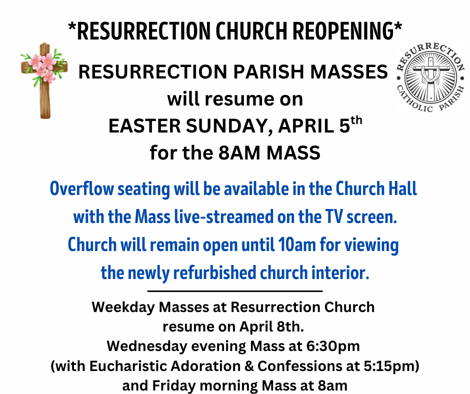 Effective 11/17/25, Resurrection Church is temporarily closed for refurbishment.