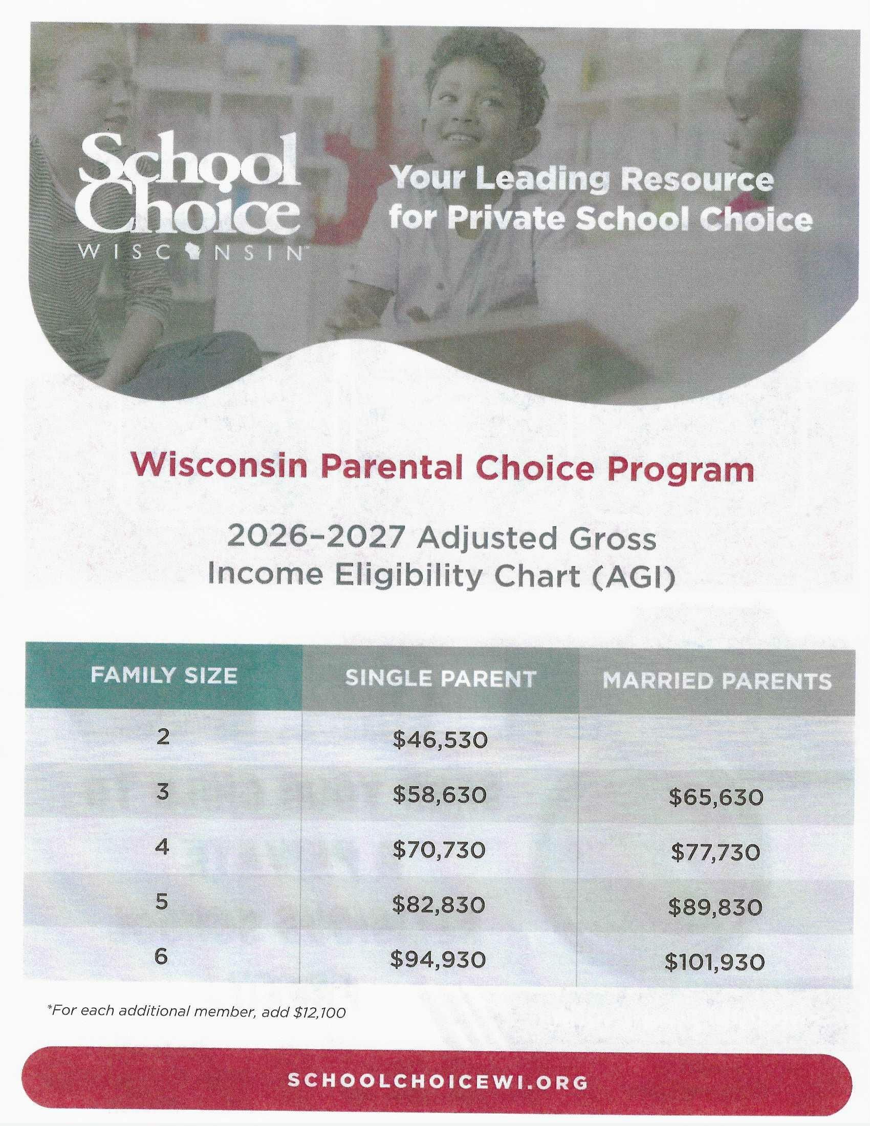 The open enrollment period for families that qualify for free tuition through the School Choice program is from February 2 - September 14, 2026. Visit schoolchoicewi.org for more information.