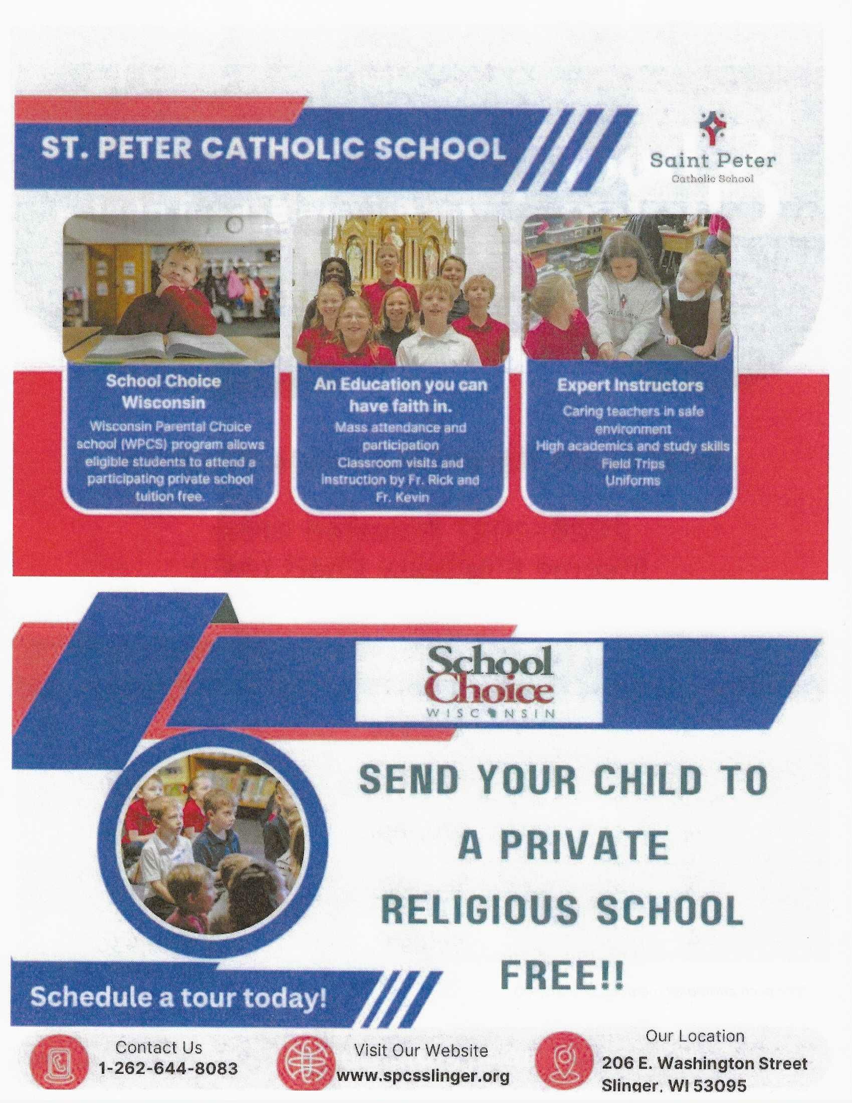 At St. Peter Catholic School, we’re inspiring young hearts, nurturing bright minds, and forming faithful leaders. Learn more by scheduling a tour today! Contact Cheryl Jaeger, Principal, at 262-644-8083, ext. 3100 or cheryl.jaeger@stpeterslinger.org. There is an informational folder in the back of the church for you to take one home!