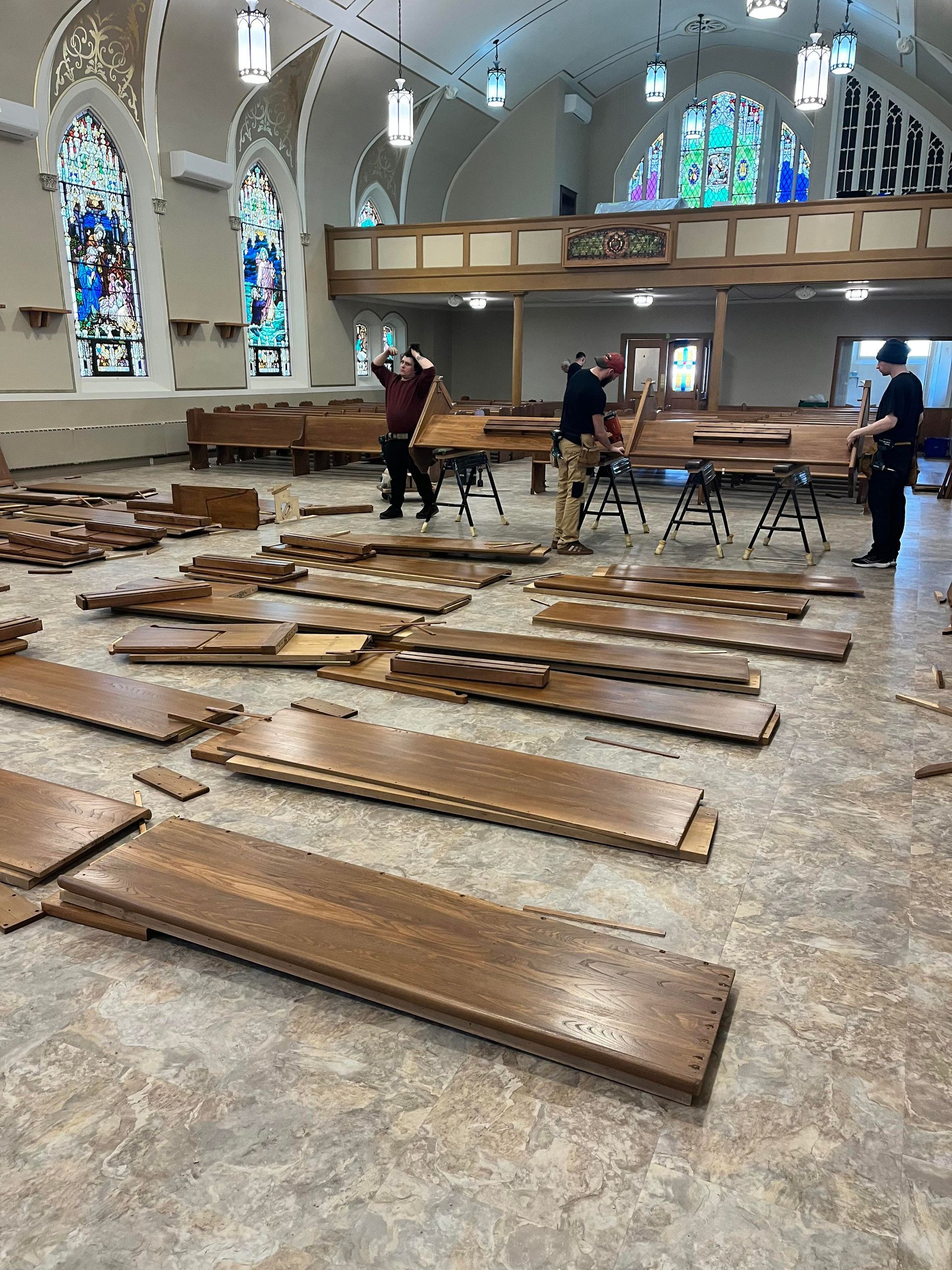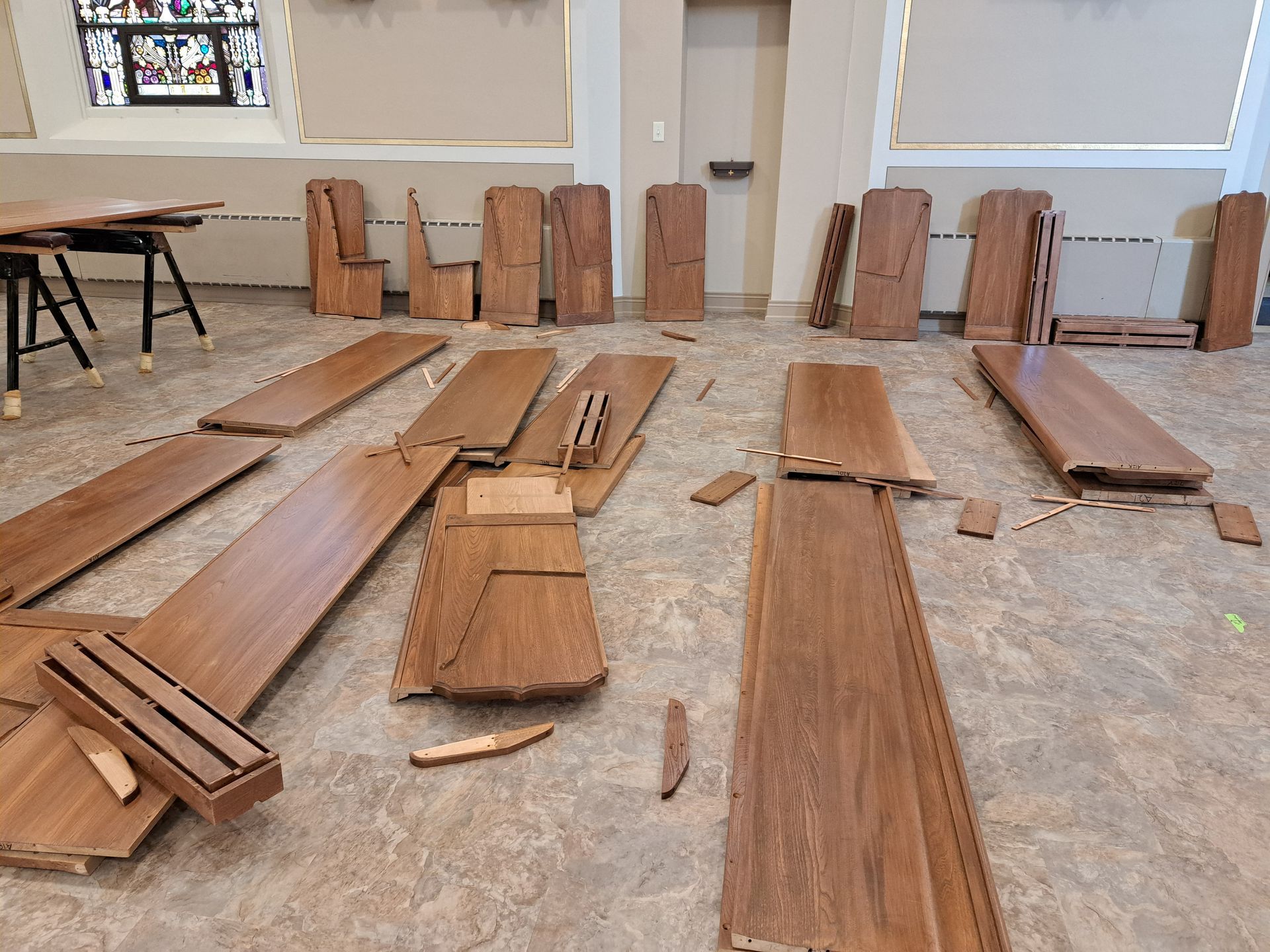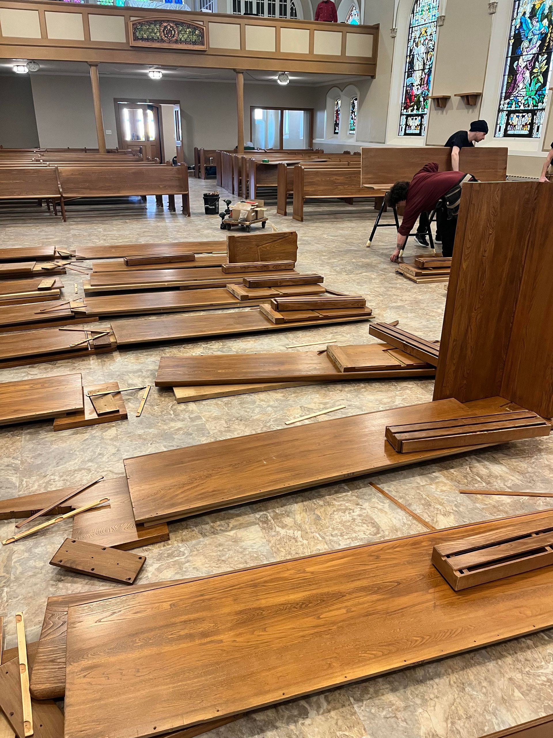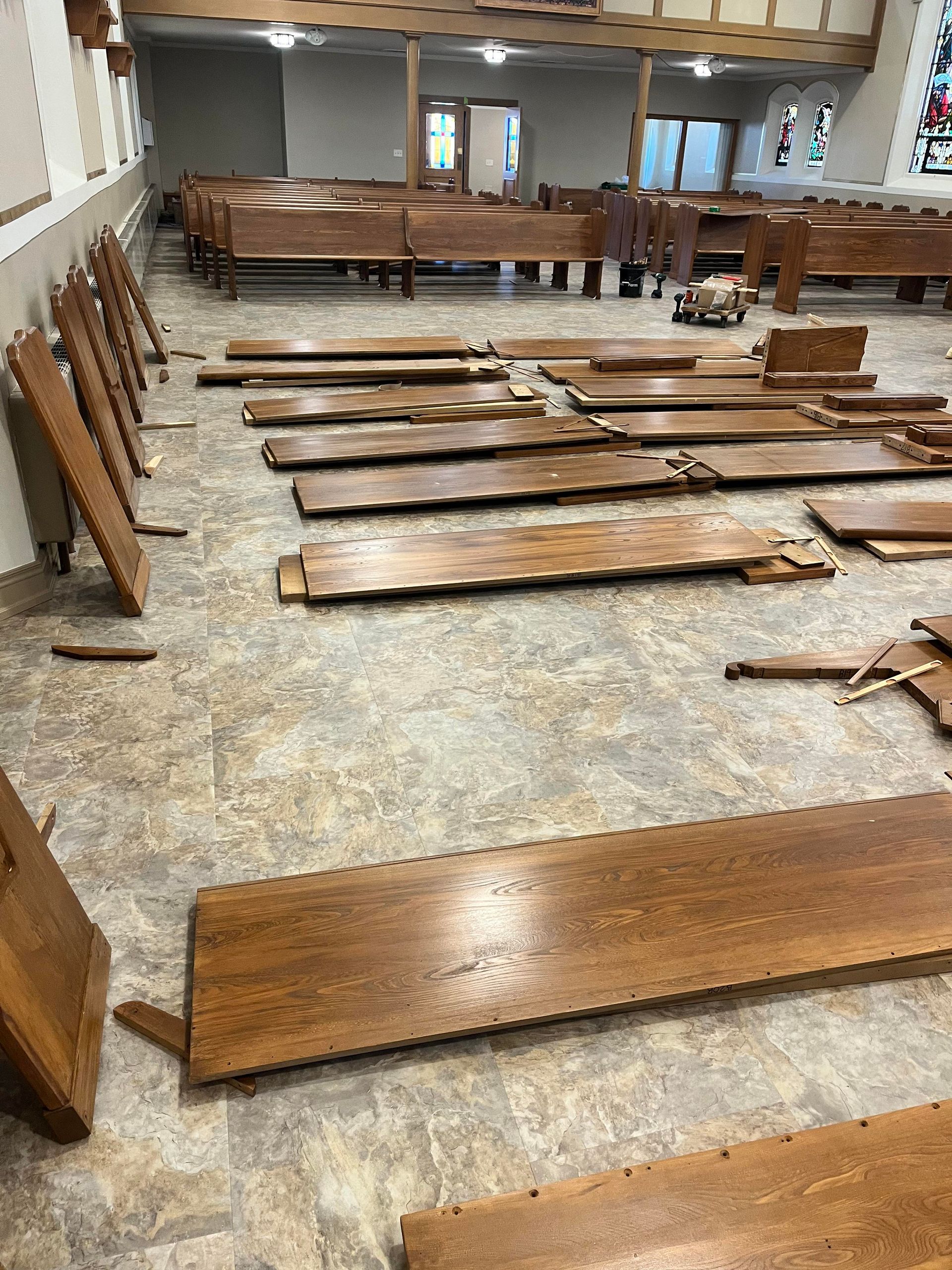 Wood Renovators was on-site to remove our pews. Removal started with marking all pew pieces before disassembly. Pew parts were then transported to their Waupaca facility for stripping, repairs and refinishing.