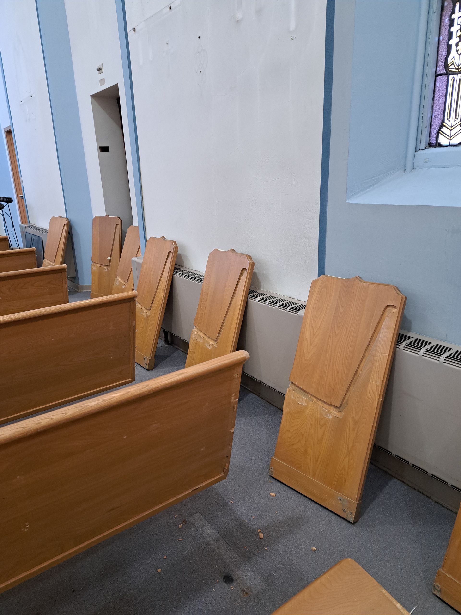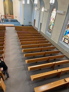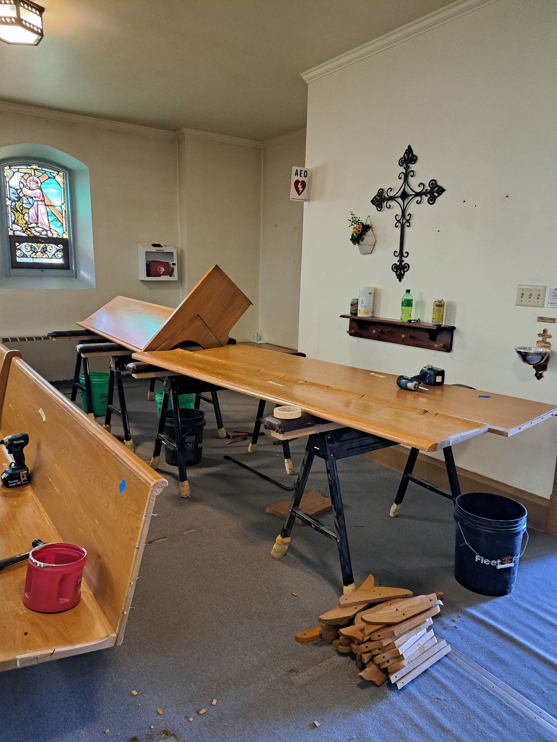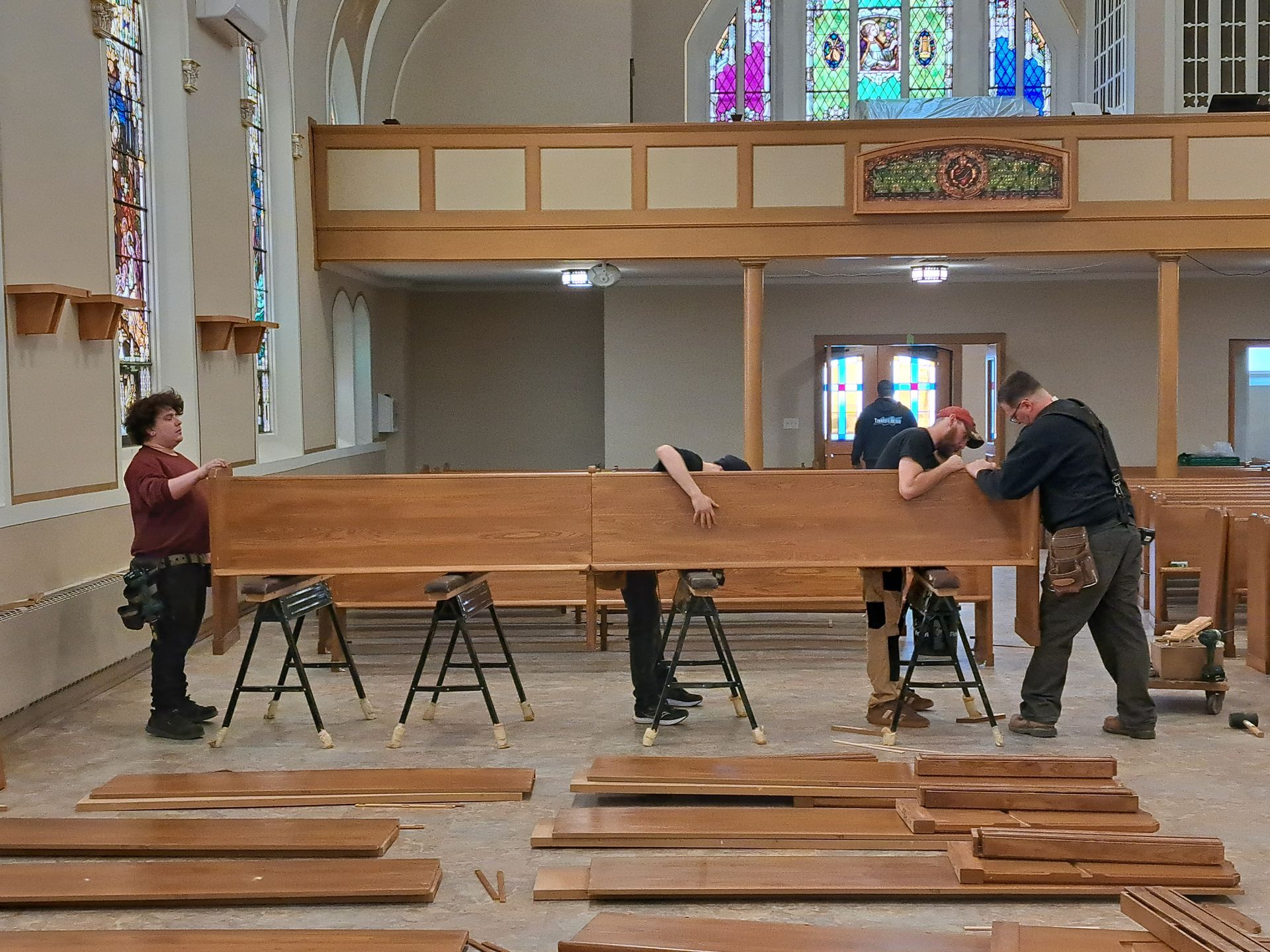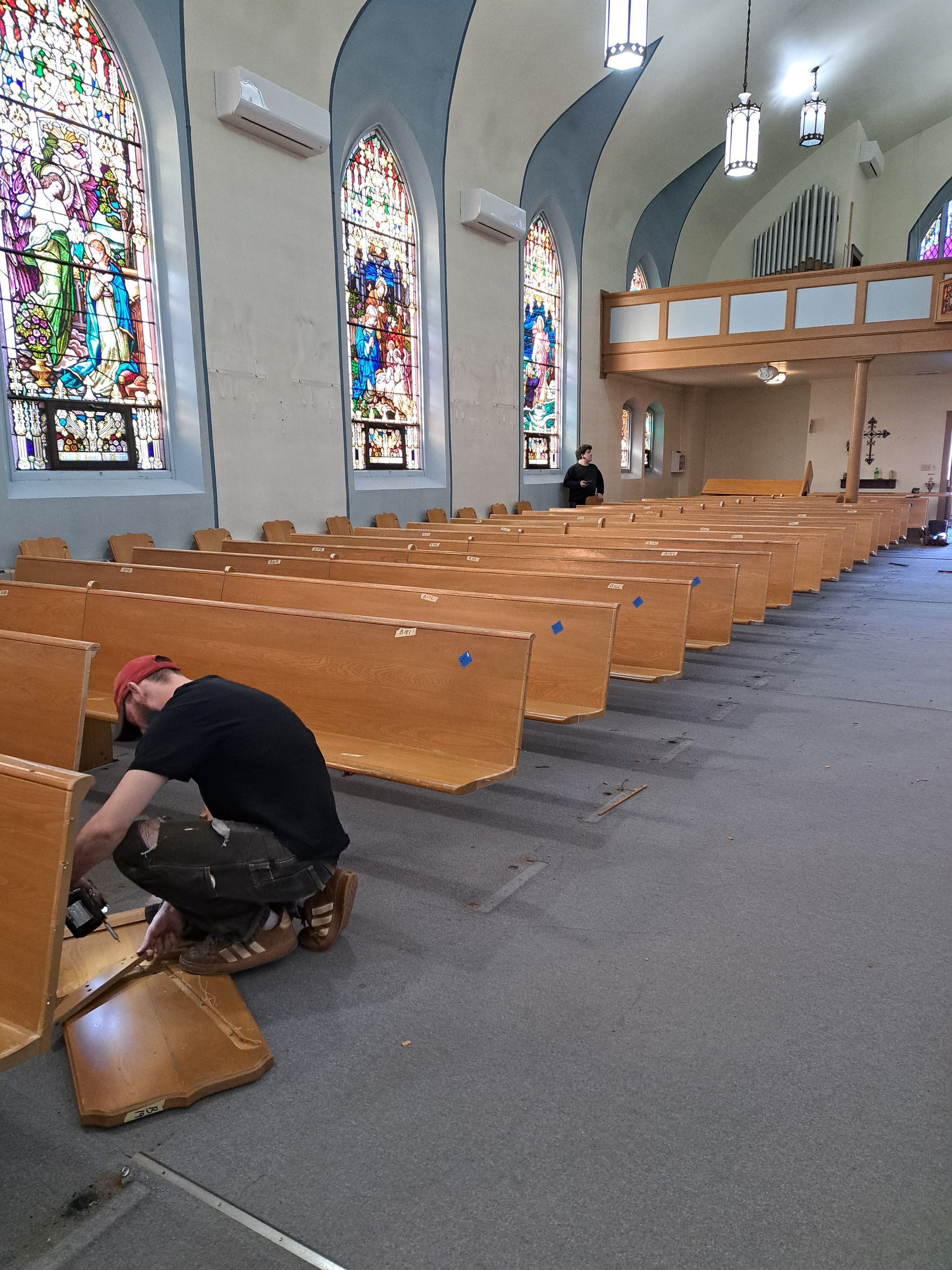 Wood Renovators was on-site to remove our pews. Removal started with marking all pew pieces before disassembly. Pew parts were then transported to their Waupaca facility for stripping, repairs and refinishing.