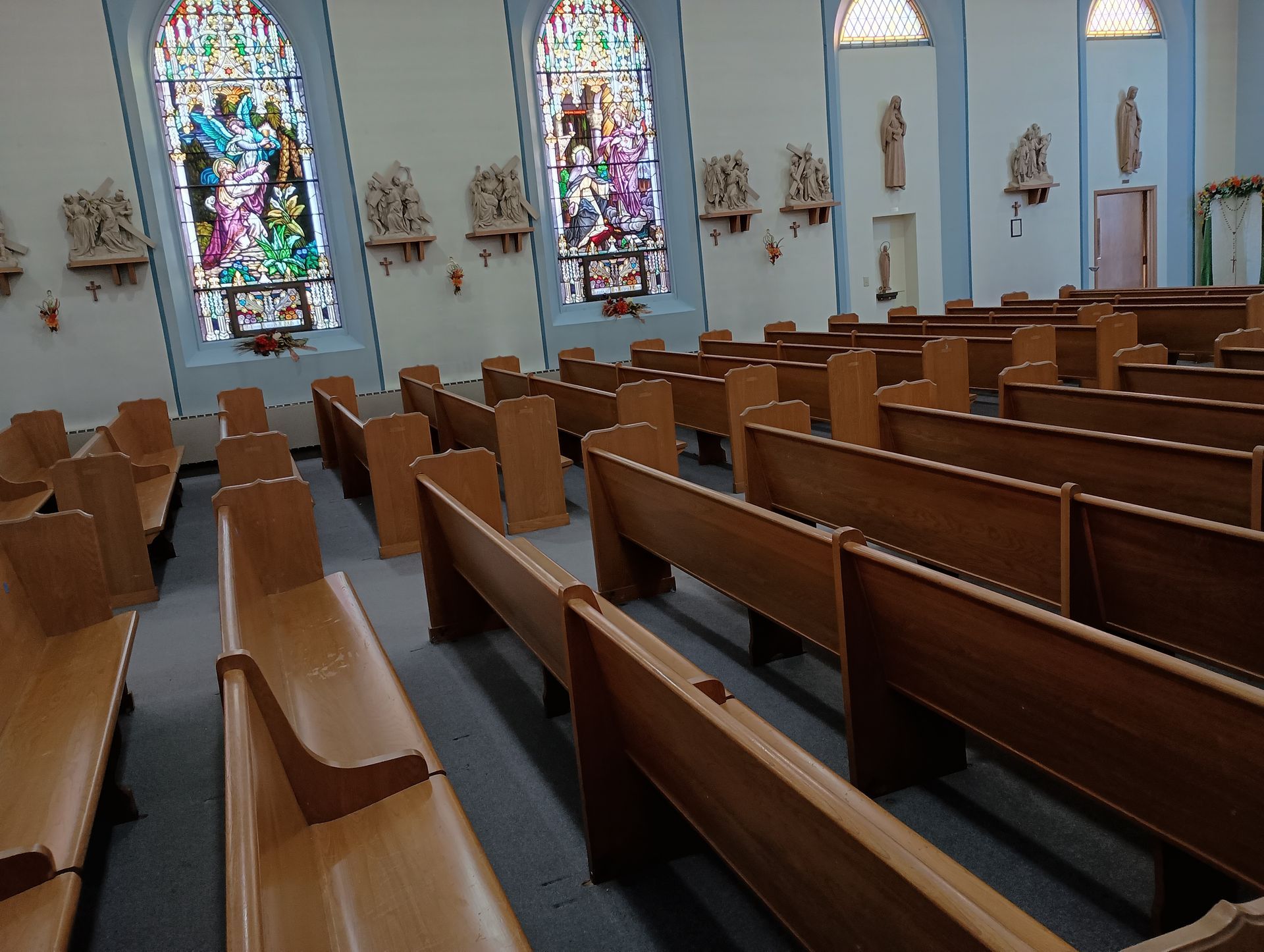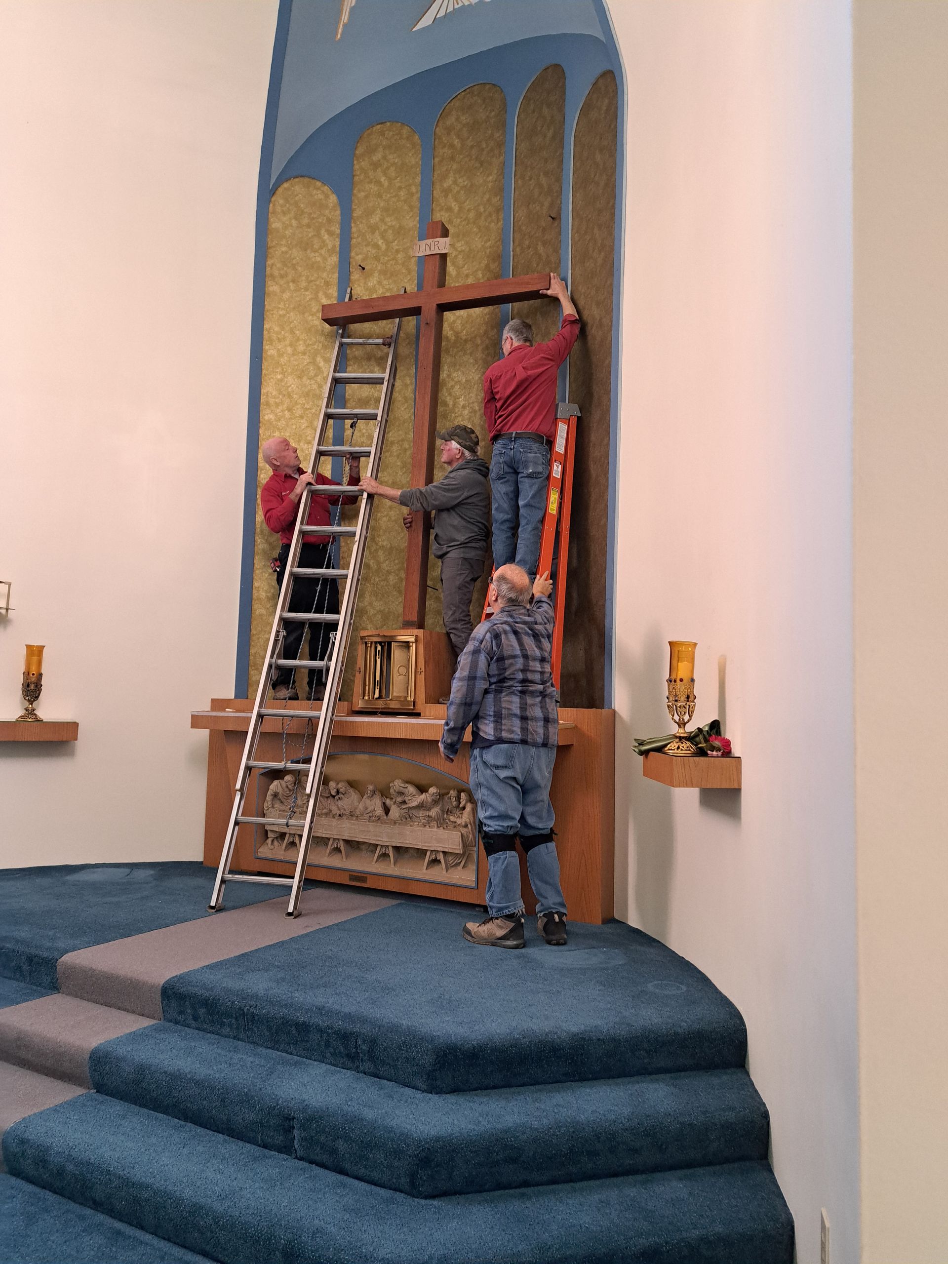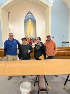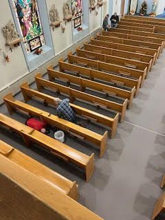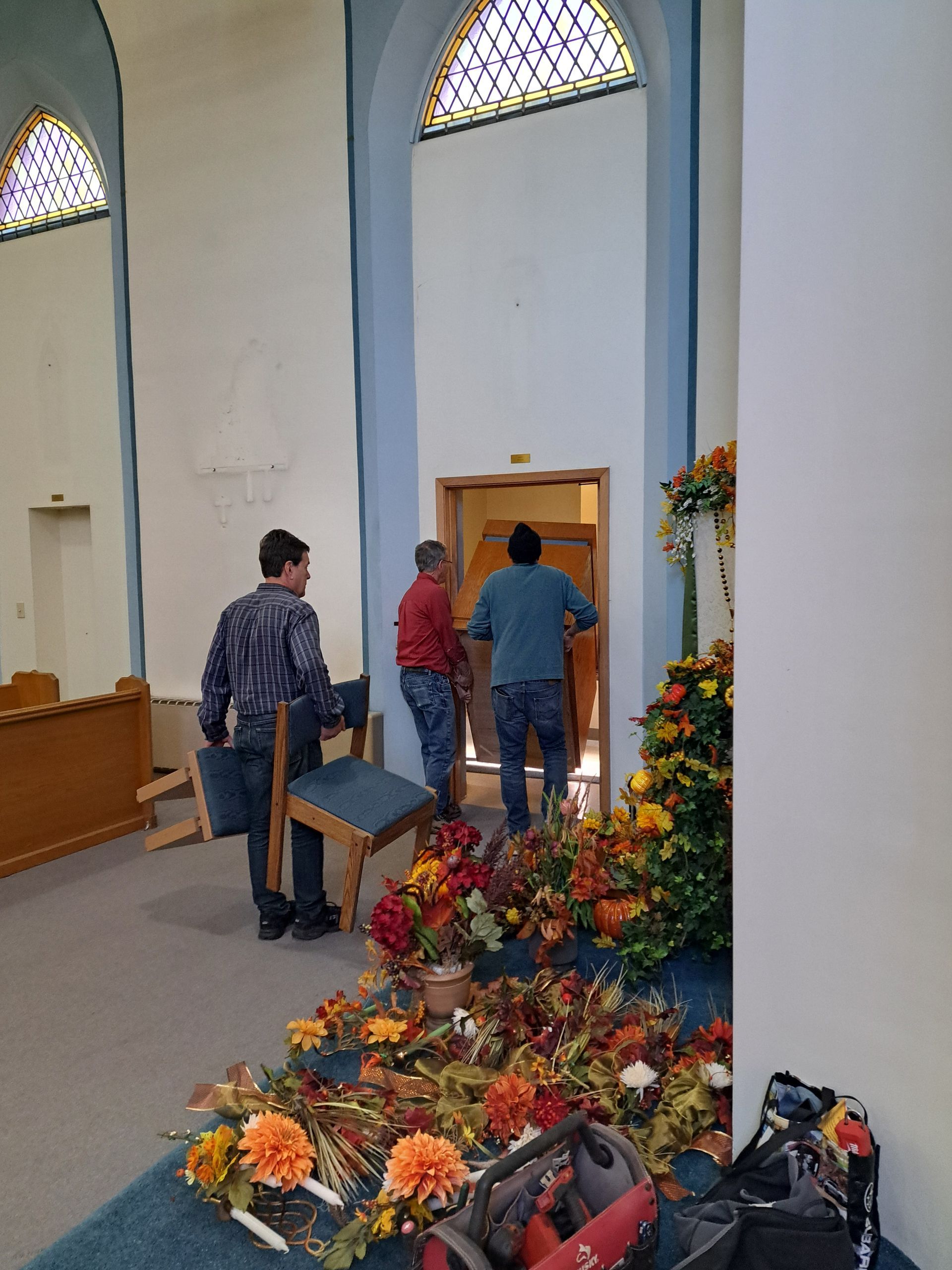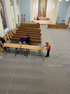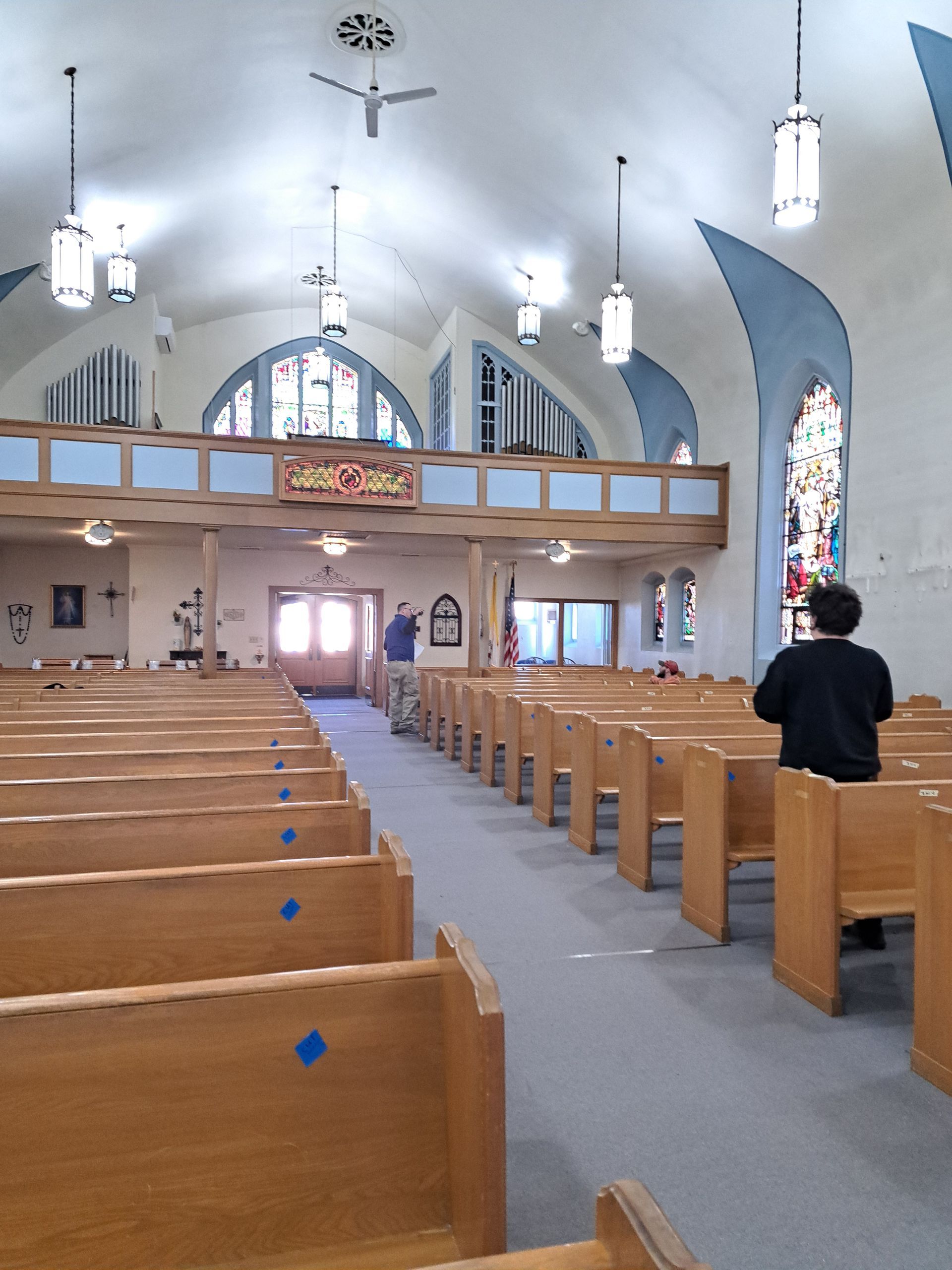 Our church beautification process began November 17, 2025. Parish volunteers helped to clear the church as much as possible to allow an open work area as our project got underway. Many hands make light work, as the saying goes. Thanks to all who helped!
