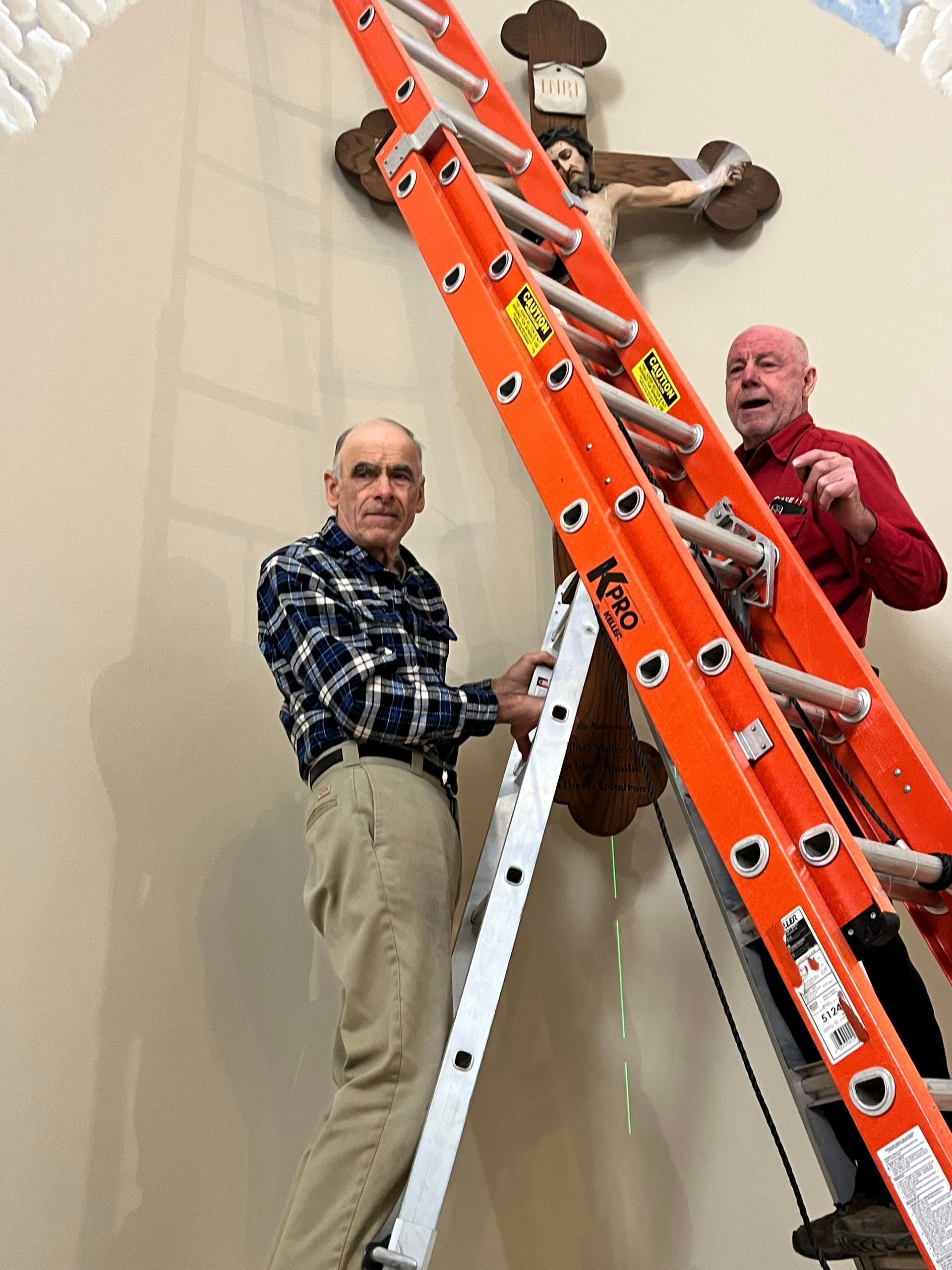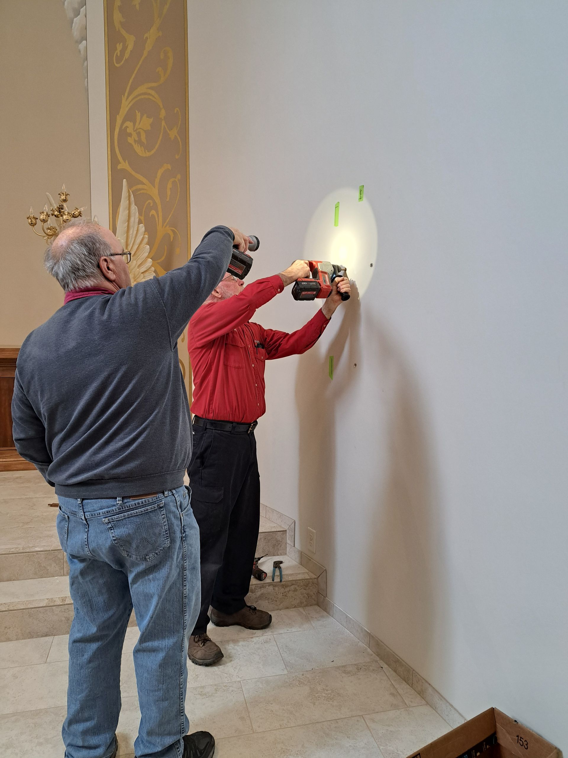 Tennies Electric on site for electrical updates, painting of the main church continues, and Gary Konrath doing his magic with cleaning up the light fixtures during our extreme cold spell.