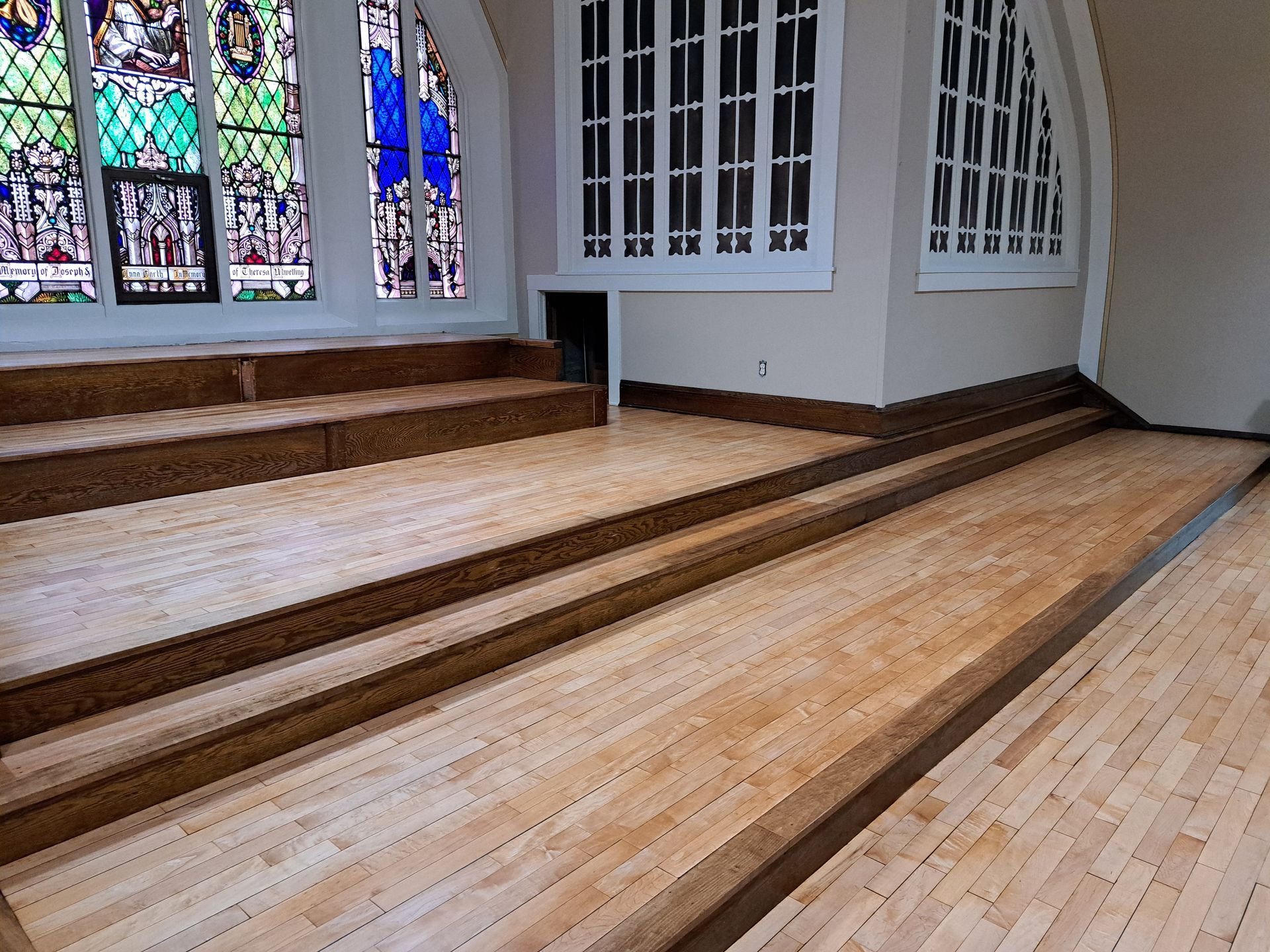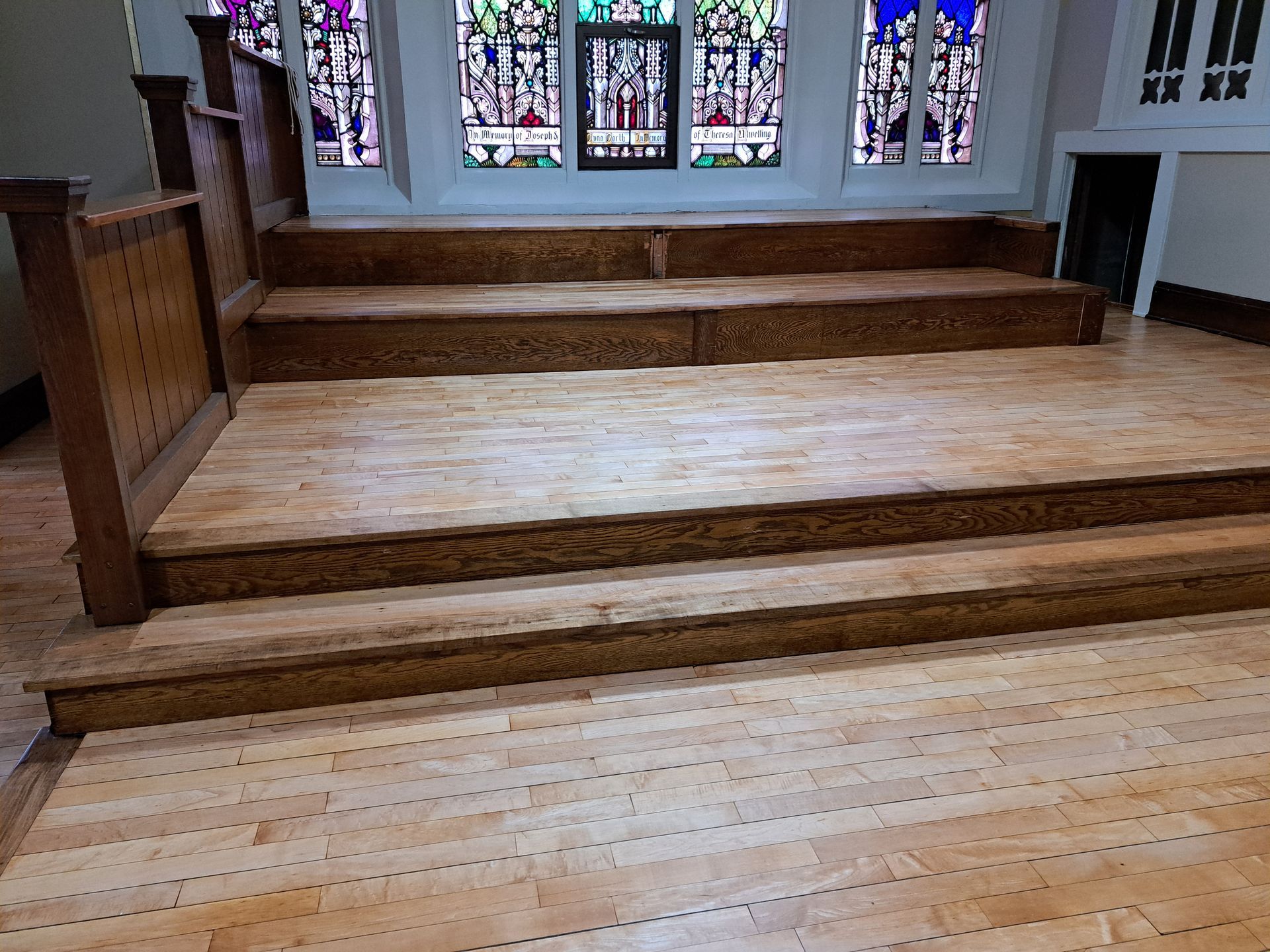 The stairs to the choir loft and the choir loft flooring were also sanded in preparation for new stain.