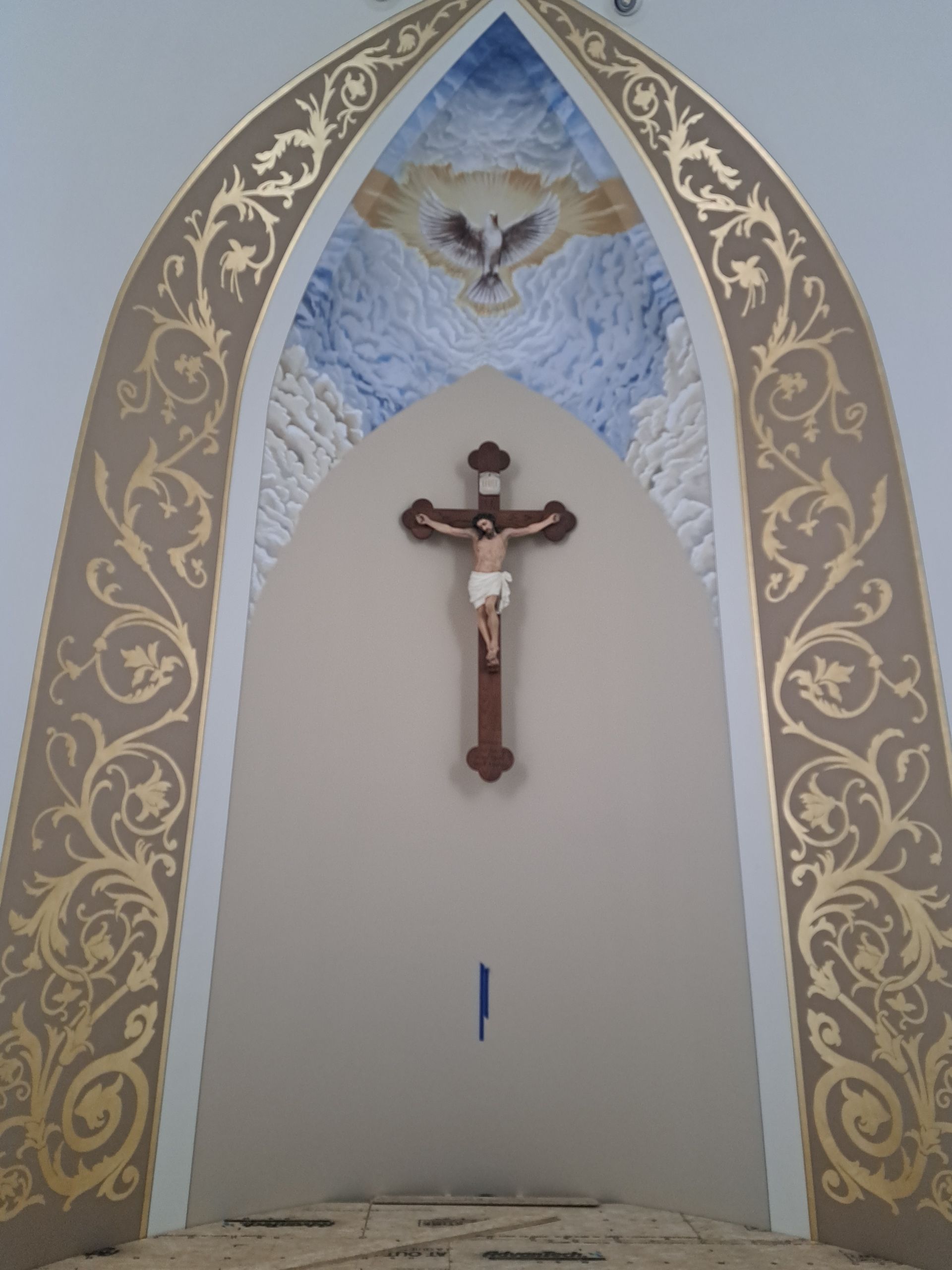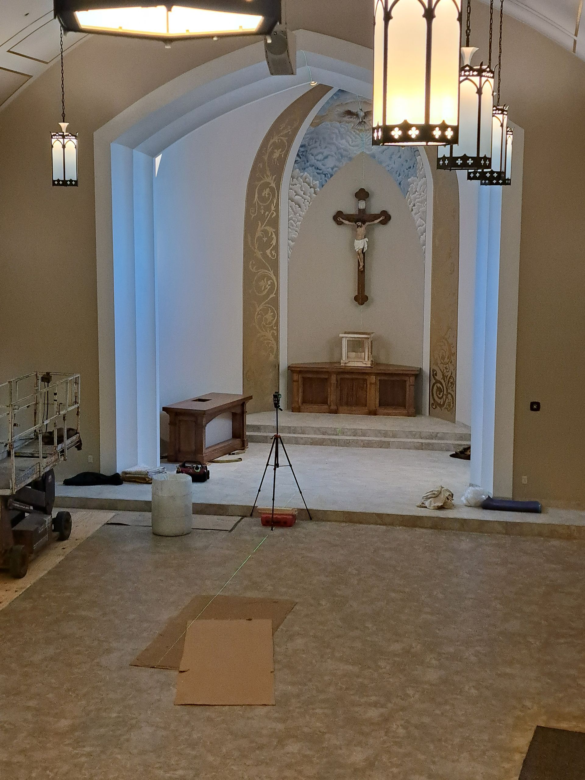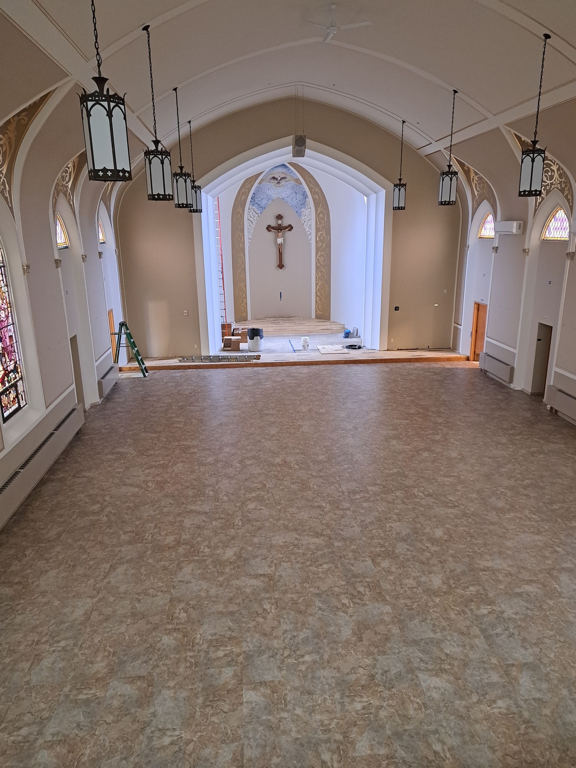 The choir loft floor was refinished, the sanctuary crucifix was hung and the luxury vinyl tile was installed.