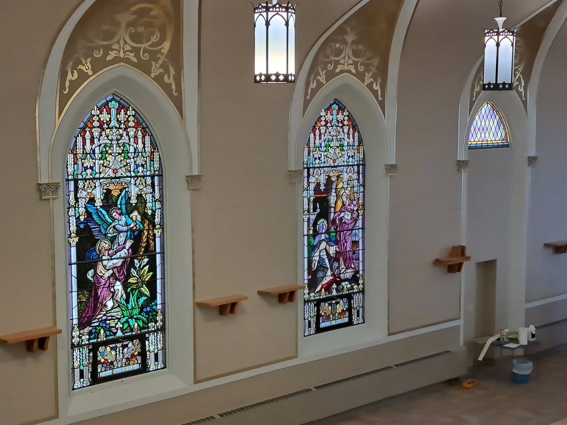 Painters working in the main entrance, cry room and stairwell to the choir; Ceiling lights refurbished and awaiting to be set back in place