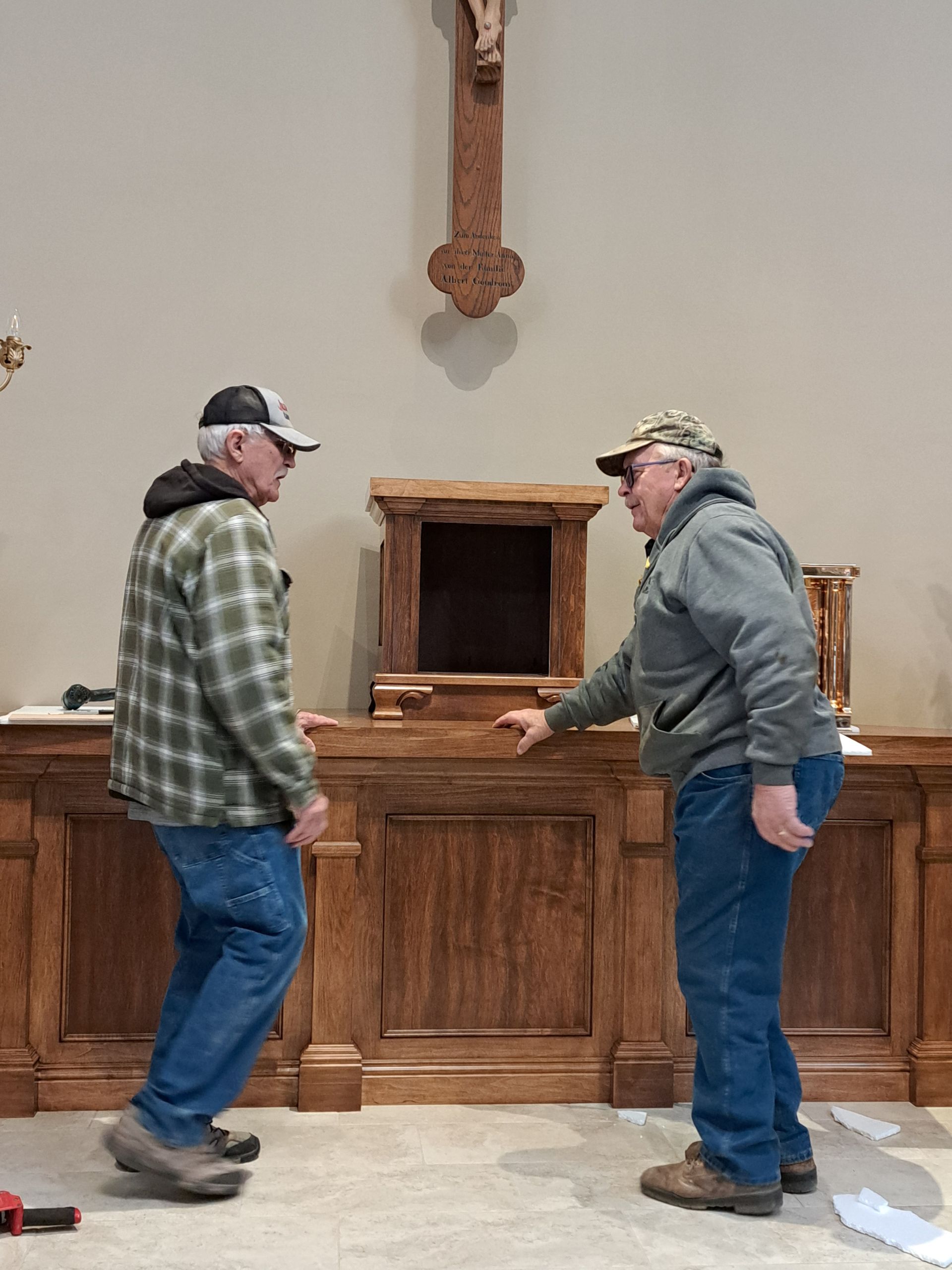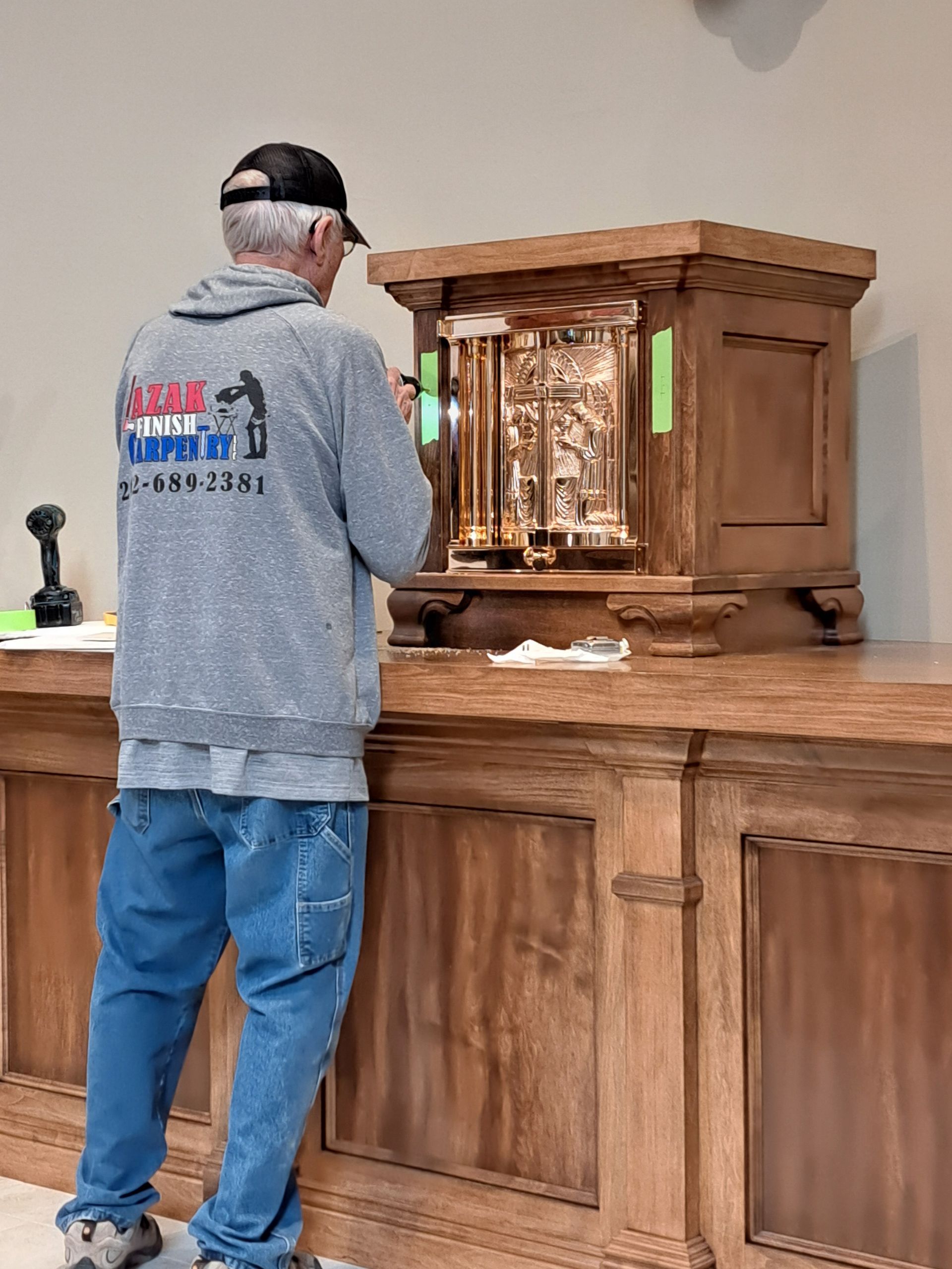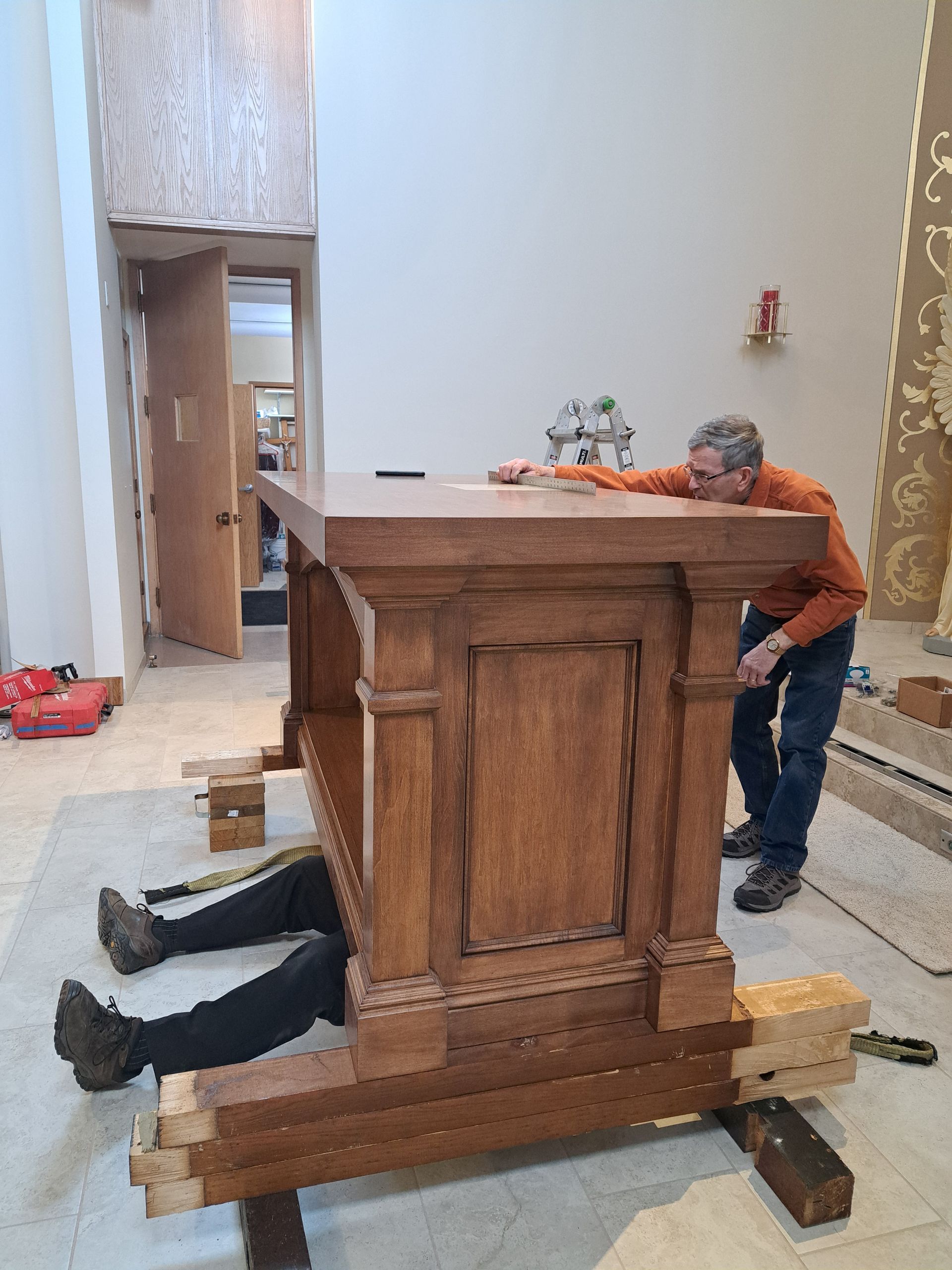 Refinished pews were delivered and installed by the Wood Renovators crew. The new main altar was set in place and the newly painted angels positioned in place. John Nettesheim made a surprise visit and checked out the newly installed front pew.