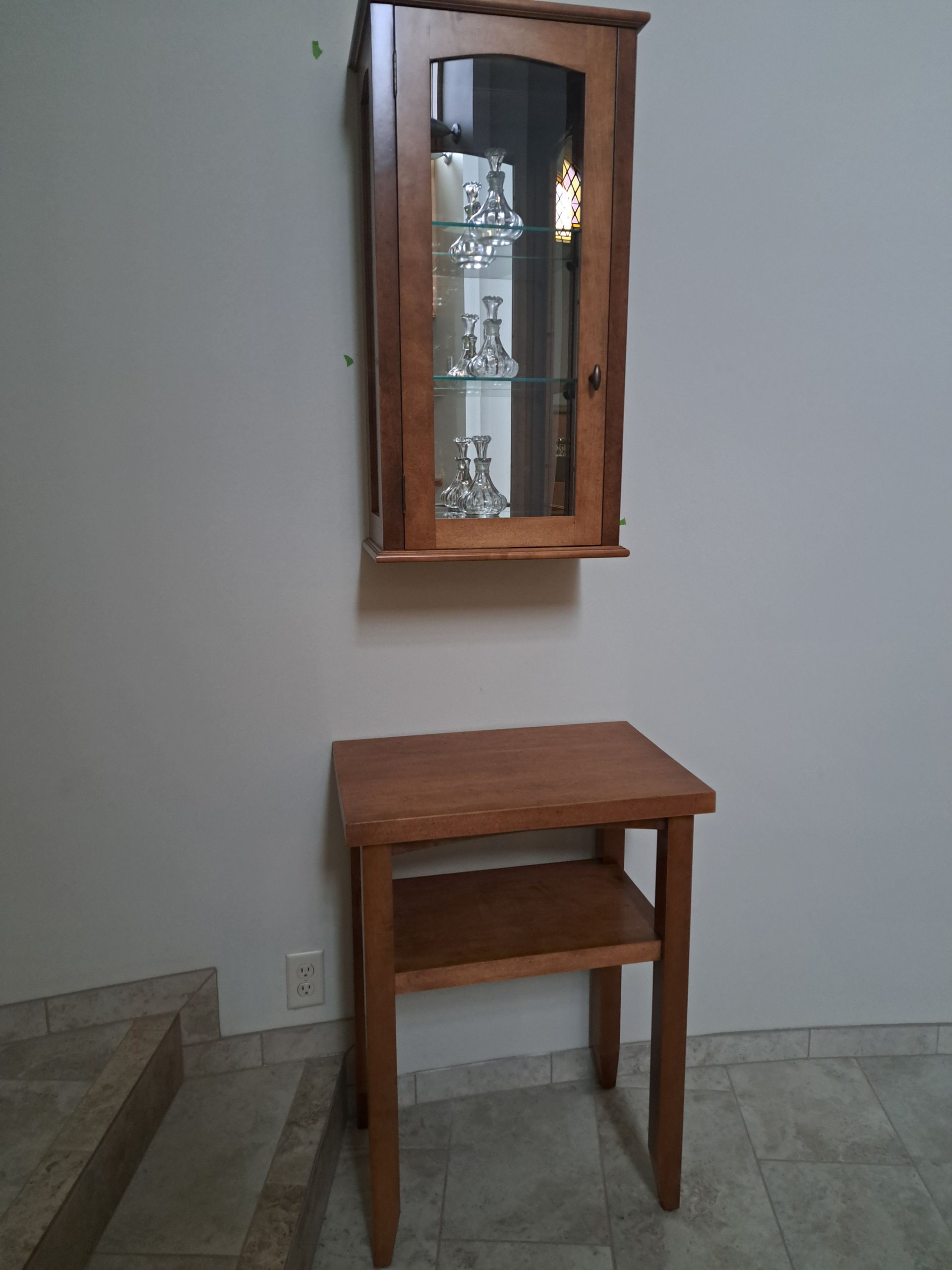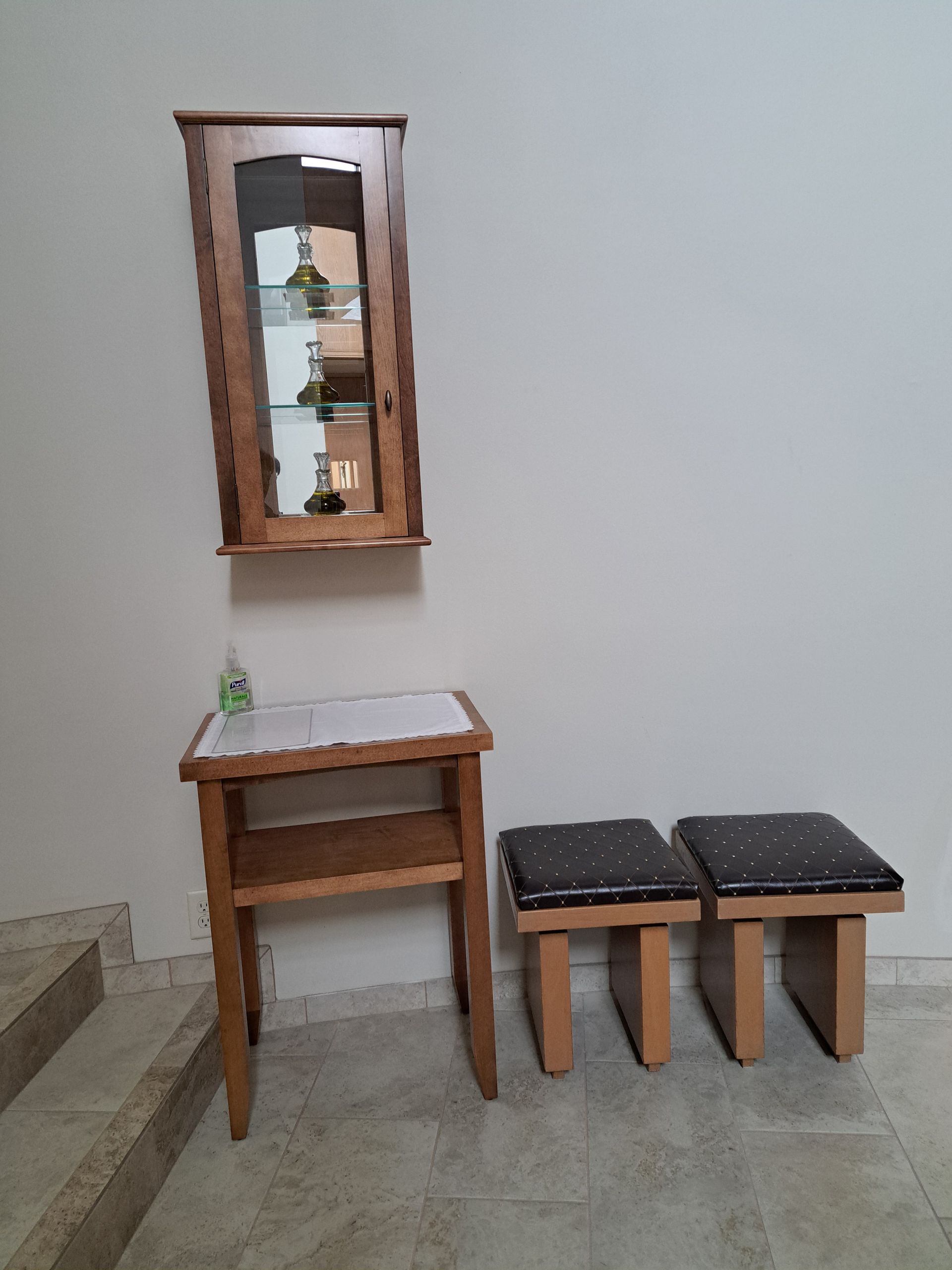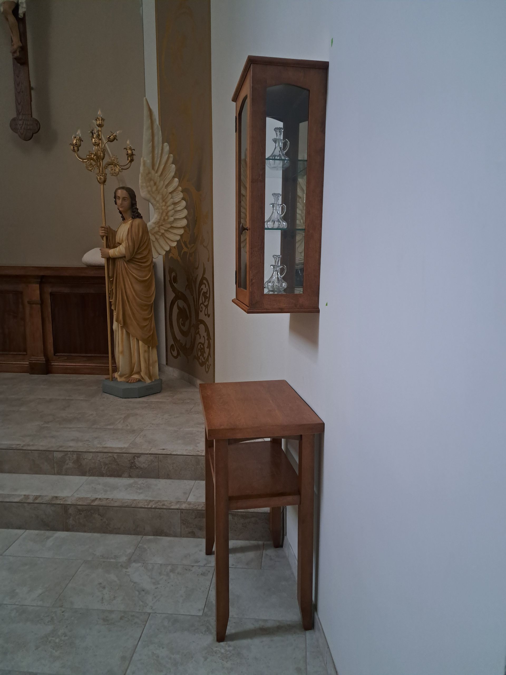 The new ambry was hung and the new credence tabel set in place. The photo shows empty ambry cruets in the ambry. The new main altar was raised in order to level the altar stone with the top of the altar.