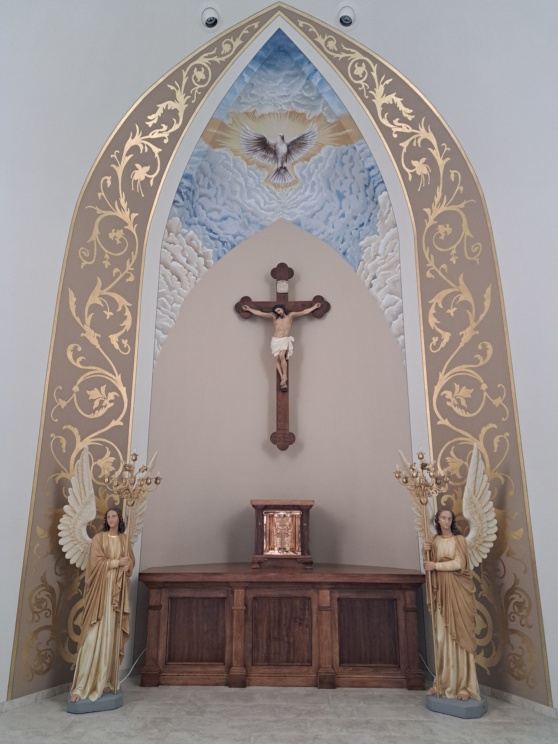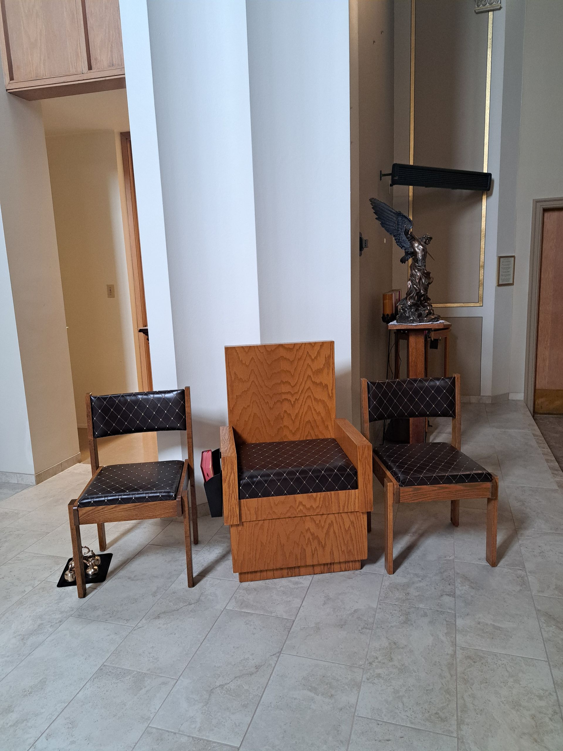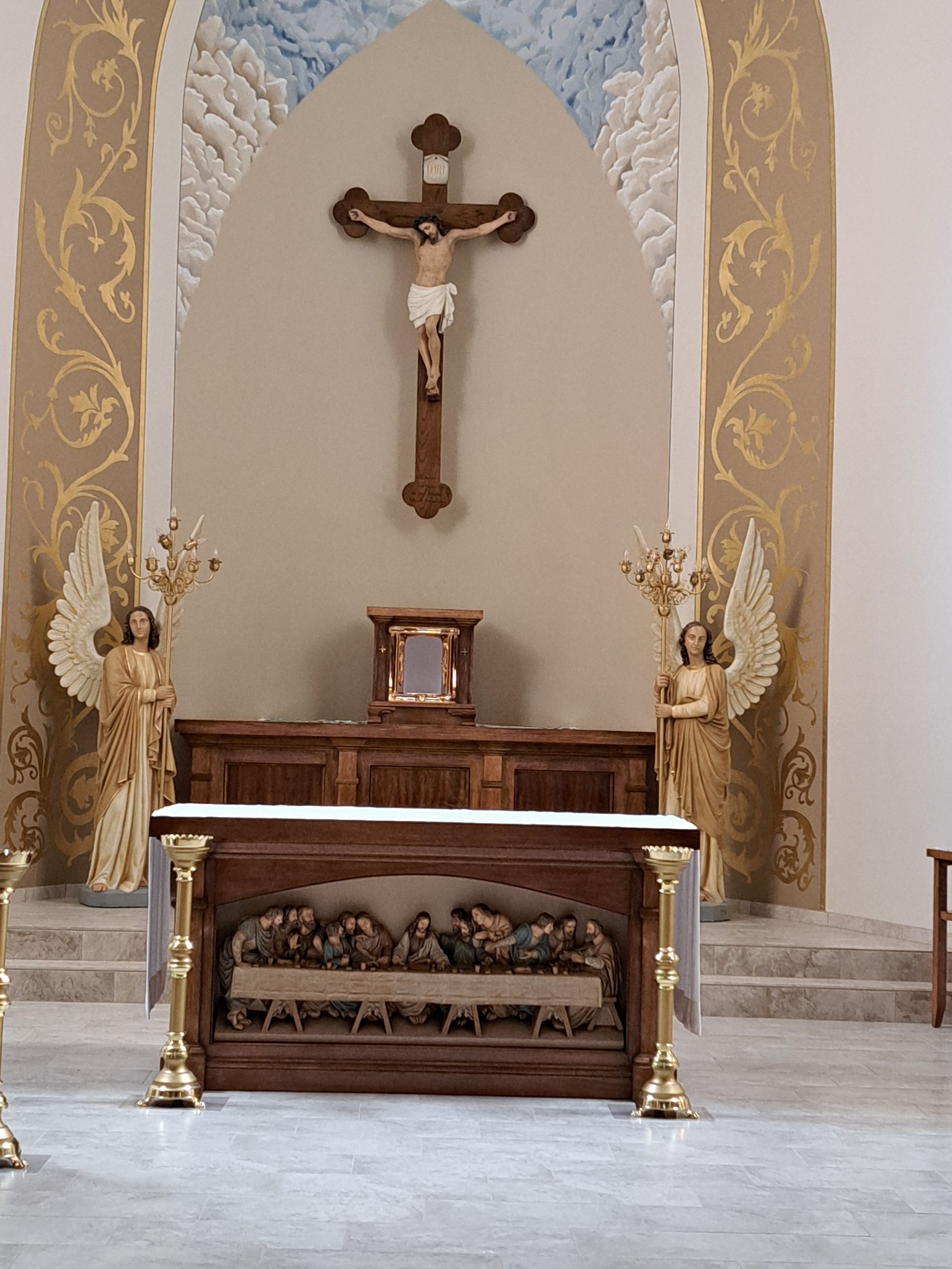 The newly painted Last Supper statue is inserted into the main altar. Reupholstered chairs are set in place.